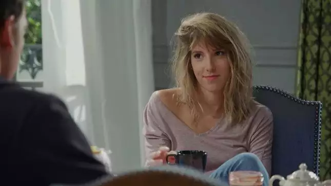Elle porte pour dormir une nuisette Arthur et en journée une tenue composée d'un T-shirt Monoprix aux tons nude, avec un jean Reiko et un sac Ikks.