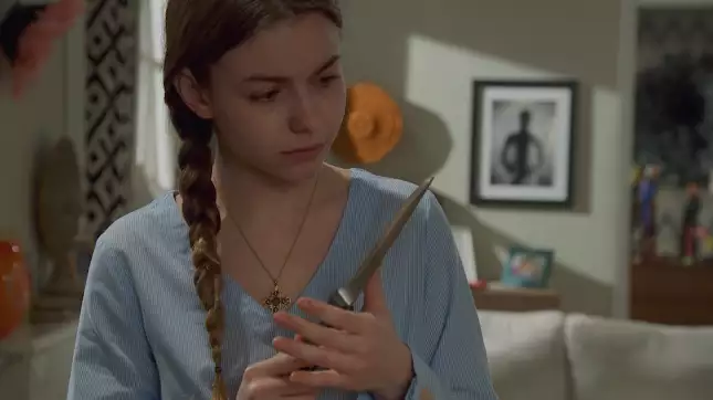 La première manifestation de ce choc est évidemment son mutisme. Mais alors qu'elle vient tout juste de se remettre à parler et qu'elle affirme à Sacha aller mieux et être en train de surmonter cette épreuve, on la surprend dans la cuisine fascinée par la lame d'un couteau qu'elle tient entre les mains
