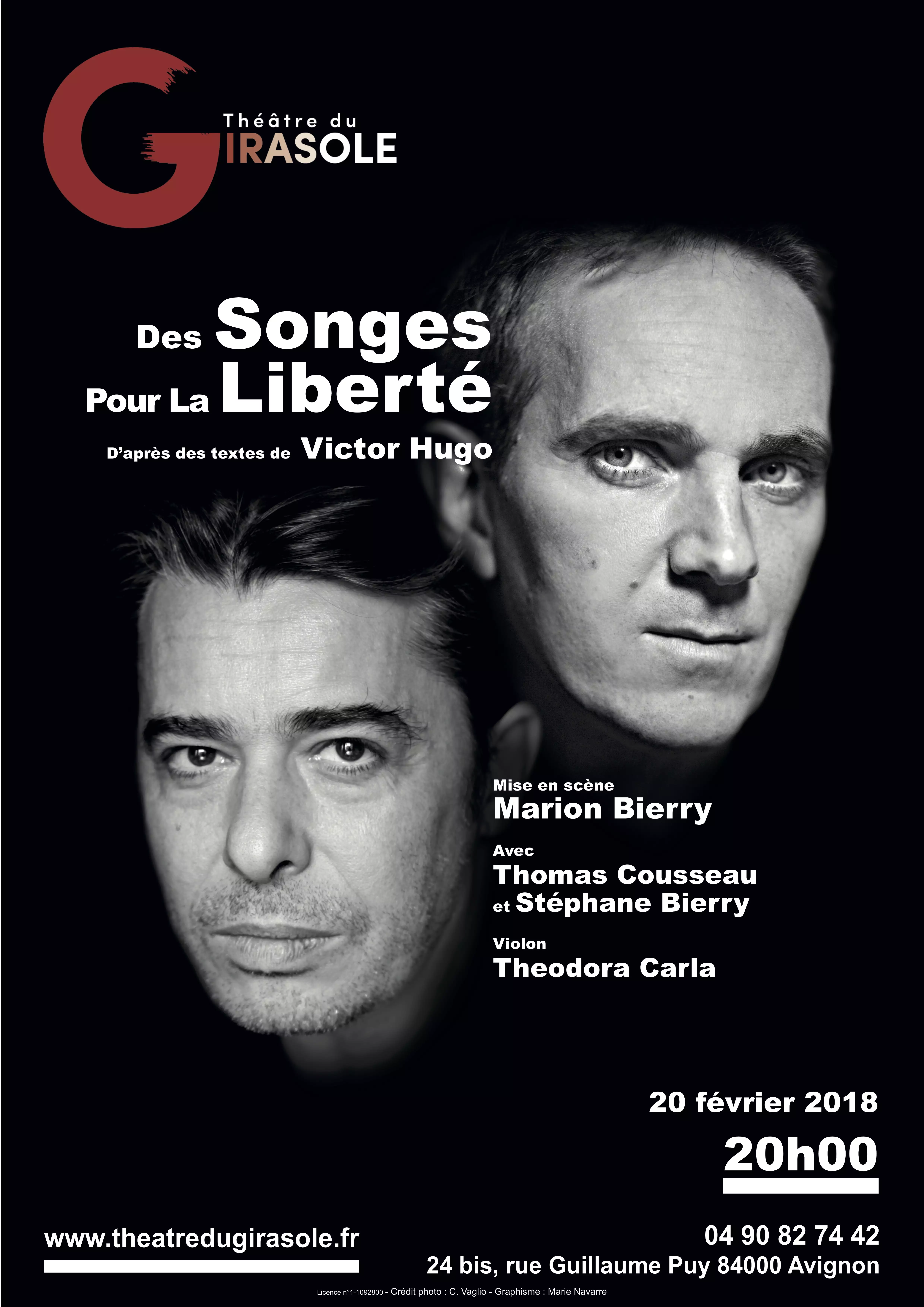 Retrouvez Stéphane Bierry qui interprète le personnage de Stéphane Prieur dans Plus belle la vie dans la pièce « Des songes pour la liberté » d'après les textes de Victor Hugo au Théâtre du Girasole (24 bis Rue Guillaume Puy, 84000 Avignon) le mardi 20 février 2018 à 20h00. L'histoire : Hugo n'en finit pas de s'adresser à nos consciences et sa « corde d'airain » continue de vibrer à travers les âges. Sa révolte rebondit d'une époque à l'autre, elle éclate, elle éclaire. Révolte sous toutes ses formes, mais aussi insolence, Hugo vient encore nous émouvoir et nous bousculer. Deux comédiens en liberté, Stéphane Bierry et Thomas Cousseau, jonglent ici à travers sa poésie, son théâtre, ses romans, accompagnés au violon par Theodora Carla. Infos pratiques : Plein tarif : 20 ? Tarif réduit : 10 ? Réservations par téléphone au 04 90 82 74 42 et en ligne sur theatredugirasole.fr.