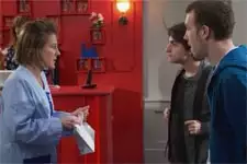 Alors que Laetitia passe l'aspirateur au Celeste voilà qu'elle voit débarquer Tom et Kévin : « Qu'est-ce qui se passe ? Il y a un problème ? ». Les adolescents sont là pour lui offrir un cadeau : « C'est pour toi. C'est un cadeau ». En ouvrant le paquet, la femme de Jérôme découvre qu'il s'agit d'une petite paire de chaussures blanches pour un bébé (comme ils pensent qu'elle est enceinte alors qu'en réalité elle révise le BAC) : « Oh, c'est trop mignon. Merci mes petits poulets ». Tom lui promet qu'à la maison elle pourra se reposer car ils vont tout faire : « Les courses, le ménage, le dîner ». Kévin confirme.