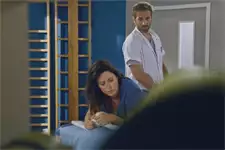 Au centre de rééducation, Bertrand, qui masse Luna, engage la conversation : « Je vous ai fait mal ? ». Elle réplique : « Non, non, non. Excusez-moi ». Il lance : « C’est ce que je vous ai expliqué tout à l’heure. Les connexions nerveuses sont en train de se recréer. Et comme votre corps n’a plus l’habitude, bah les sensations sont décuplées. Au début vous allez avoir un peu mal mais avec le temps vous allez vous habituer. Là , ça va ? »