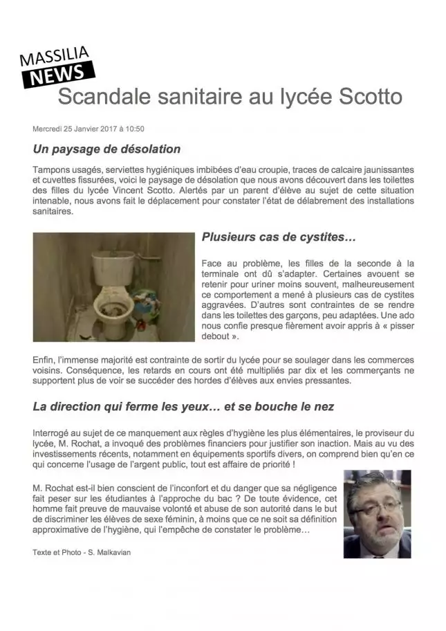 Depuis quelques jours, une crise sanitaire fait trembler les murs du Lycée Vincent Scotto ! En effet, les élèves, ainsi que Jérôme, se mobilisent pour obliger Rochat à rénover les toilettes de l'établissement qui sont dans un état catastrophique ! Alors que pour le moment le proviseur refuse de faire des travaux (car il n'a pas le budget nécessaire) voilà qu'il va se retrouver face à une terrible menace ! En effet, Sacha va rédiger un article (cliquez sur l'image pour le visualiser) à destination du site d'infos « Massilia News » dans le but de révéler cette histoire aux lecteurs... Le compagnon de Luna ira-t-il jusqu'à publier cet article ? Rochat parviendra-t-il à gérer la crise avant que le monde en soit informé ?